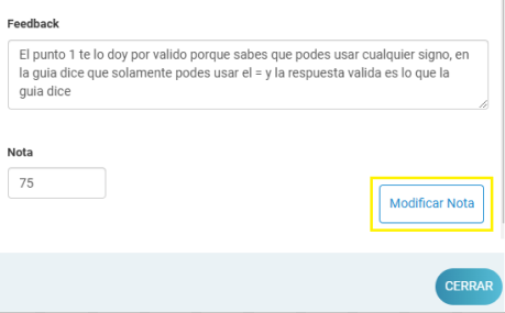 Para editar la nota de las evoluciones es obligatorio completar el campo Feedback, una vez modificada la nota, y colocado el feedback, se debe oprimir el botón > Modificar Nota para guardar el cambio.