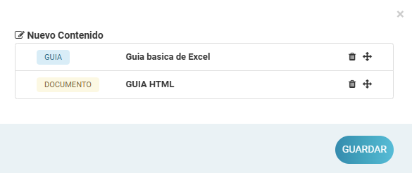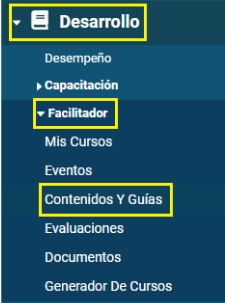 Desde este menú el facilitador podrá crear contenidos y guías que se asociarán al evento creado en el punto anterior.
