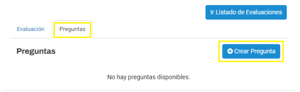 Luego de guardar la evaluación, se habilita la pestaña preguntas. Al dar click en esta pestaña encontrarás la opción para agregar las preguntas de la evaluación. Para agregar preguntas deberás dar click en el botón Crear Pregunta.
