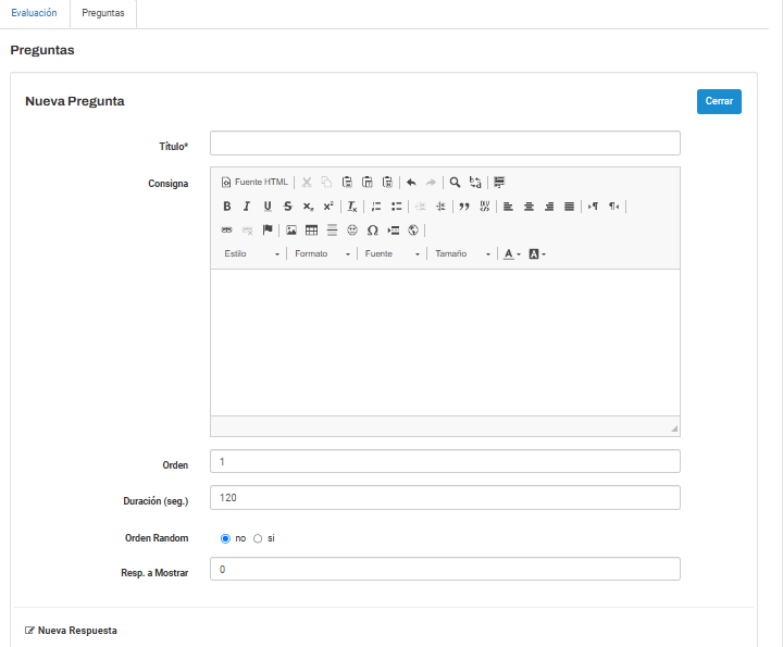 Al dar click en el botón Crear Pregunta, se mostrará un formulario para realizar la carga de las preguntas.