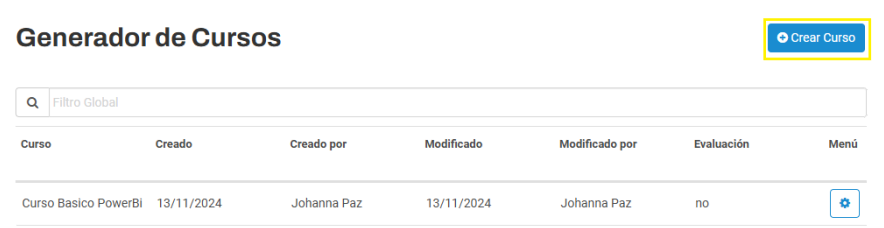 Para generar un nuevo curso el facilitador tendrá que ir al botón > Crear Curso y ahi comenzar a crearlo