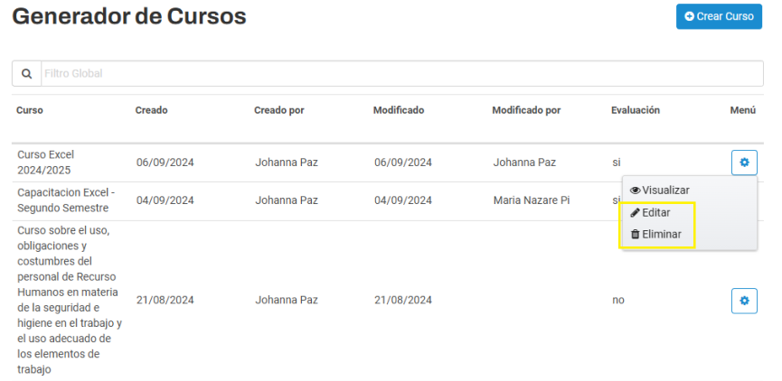 Si deseas editar o eliminar algún curso guardado deberás ir al botón acciones y seleccionar la opción que corresponda.
