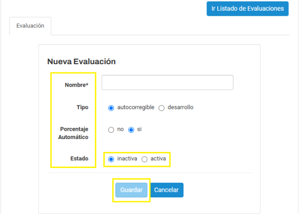 Se mostrará un formulario que el facilitador debe completar para crear la evaluación. Una vez que se hayan completado los datos, se debe dar click al botón > Guardar. Es importante que la evaluación se cree en estado inactiva para poder agregar las preguntas de dicha evaluación, antes de estar disponible para ser usada.