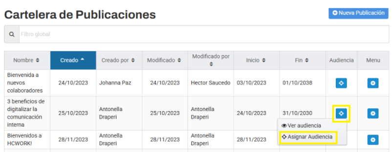 Dentro de la Cartelera de Publicaciones se encontrarán todas las comunicaciones creadas en orden de la más reciente a la más antigua. Para asignarle audiencia y que el colaborador la visualice en su portal autogestión, debe ir a la columna "Audiencia" y hacer click en el botón, luego se desplegarán dos opciones: Ver audiencia y Asignar Audiencia.