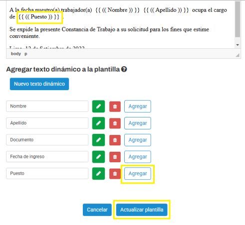 Para agregar este texto dinámico creado dentro de la plantilla se tiene que hacer click en el botón "Agregar" sobre en el cuerpo de la plantilla, en el lugar donde estará ubicado. Si está bien colocado se podrá observar el nombre del texto dinámico entre llaves y paréntesis.