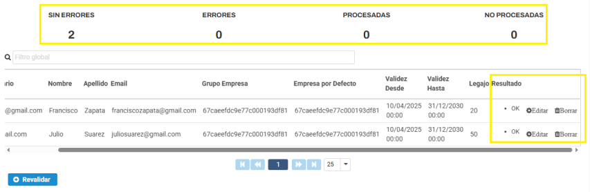 Al cargar al archivo encontrará en la pantalla la cantidad de datos con o sin error, ahímismo en el resultado tendrá la opción de Editar o Borrar ese usuario, sin necesidad de modificarlo en el archivo.