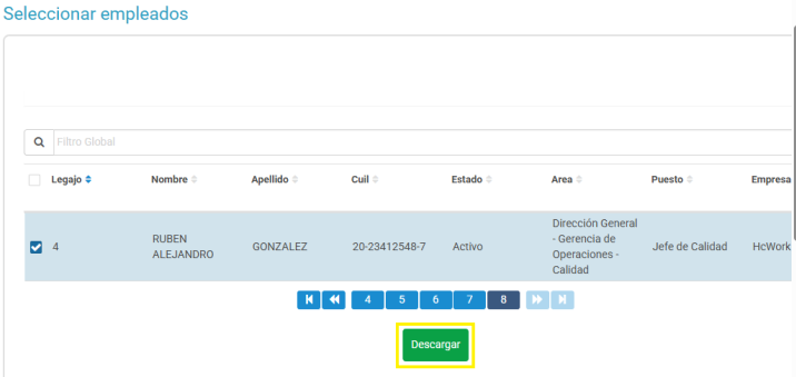 Cuando se oprime el botón Buscar empleados se mostrará el listado de los colaboradores a los que se le desea cargar información, una vez que se hayan seleccionado el o todos los colaboradores, por último se debe ir al botón Descargar.