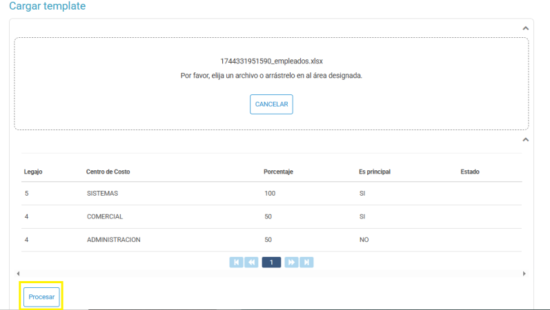 - Es principal: teniendo en cuenta el punto anterior, si le asignamos a los colaboradores más de un centro de costo, uno OBLIGATORIAMENTE deberá ser el principal, de lo contrario el archivo no podrá subirse.