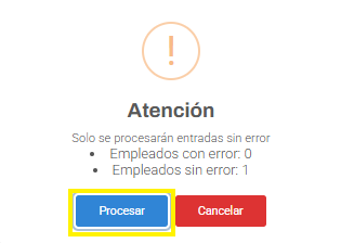 En todos los procesos de carga masiva anteriores, al presionar el botón Procesar automáticamente saldrá en la pantalla un cartel de advertencia que nos indicará la cantidad de empleados con y sin error vamos a procesar. Si todo está correcto, podremos procesar sin ningún problema el template.