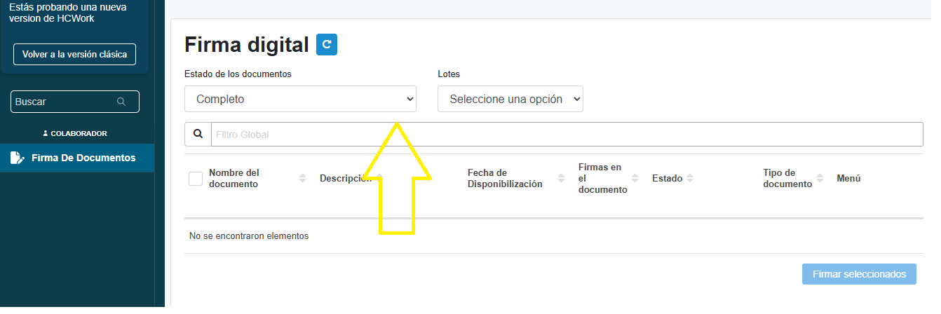 - En el desplegable de Estado de los documentos, deben seleccionar Pendiente Firma Colaborador, en ese estado los documentos se mostrarán en estado pendiente firma del colaborador.