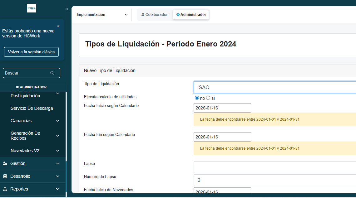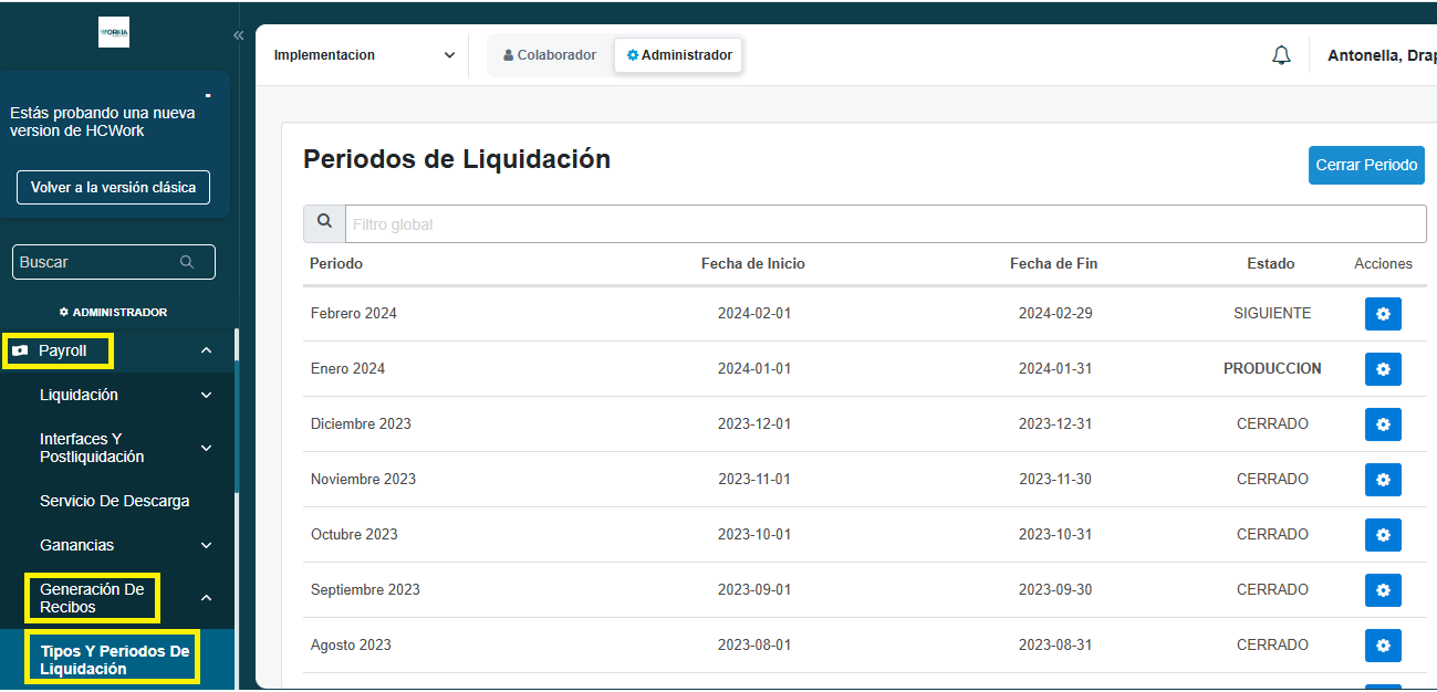 - Ingresar al menú lateral izquierdo en Payroll> Generación de Recibos > Tipos Y Períodos De Liquidación. Para habilitar un nuevo período, debe hacer clic en Cerrar Período, y automáticamente se generará uno nuevo.