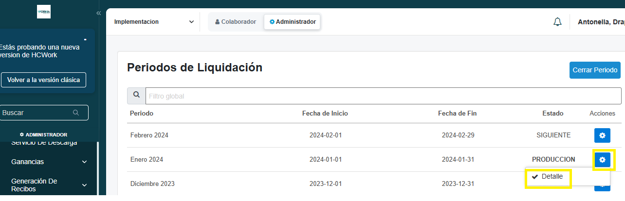 2. Para configurar el tipo de liquidación, debe hacer clic en el menú de acciones y en Detalle.