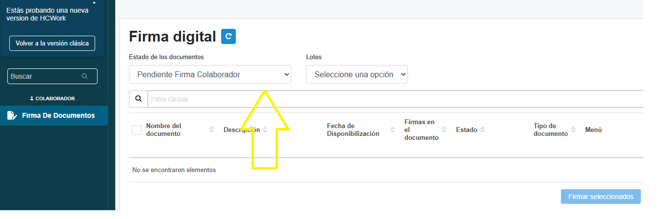 - En el desplegable de Estado de los documentos, deben seleccionar Pendiente Firma Colaborador, en ese estado los documentos se mostrarán en estado pendiente firma del colaborador.