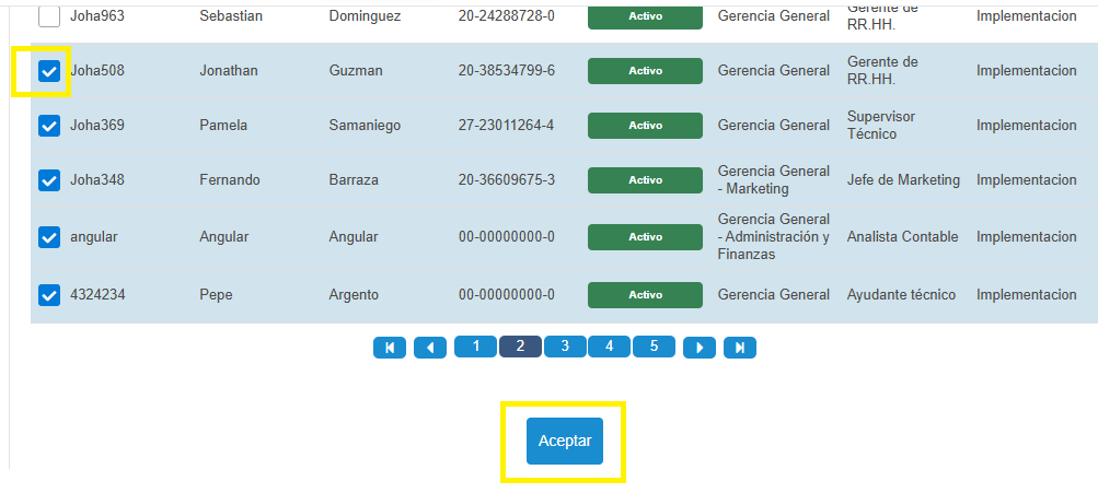 - Seleccionar los colaboradores a los cuáles queremos generarles sus recibos. Luego oprimir el botón aceptar.